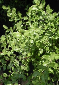 Gray-blue, evergreen leaves with wavy margins give an overall smoky look. Bushy, pyramidal habit needs little pruning and makes a nice hedge. Small inconspicuous maroon flowers in spring. (Shrub)