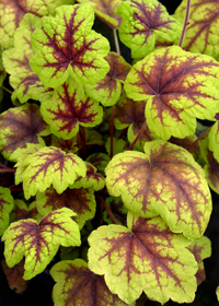Very large leaves in spring have a bright yellow-green color with wide, deep red veining. The leaves mature in summer to a warm straw and green color. White flowers appear in spring. (Perennial)
